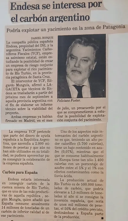 + Bueno, todo eso y mucho más es Río Turbio. Una historia más negra que el carbón. Hoy, entre los archivos de este cronista, apareció este artículo de comienzos de los '90 que prometía que la española Endesa y la entonces Yacimientos Carboníferos Fiscales (YCF) explotarían Río Turbio en conjunto para exportar 500.000 toneladas de carbón. A España y Europa