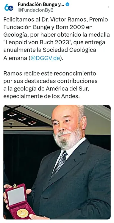 Víctor Ramos es el primer geólogo en recibir el premio Bunge y Born, importante distinción a la trayectoria que obtuvieron, antes que él, Luis Federico Leloir y Armando Parodi, entre otros. El prestigioso geólogo recibió la medalla Leopold von Buch 2023, otorgada por la Sociedad Geológica Alemana, uno de los premios más importantes de esa disciplina en el mundo.