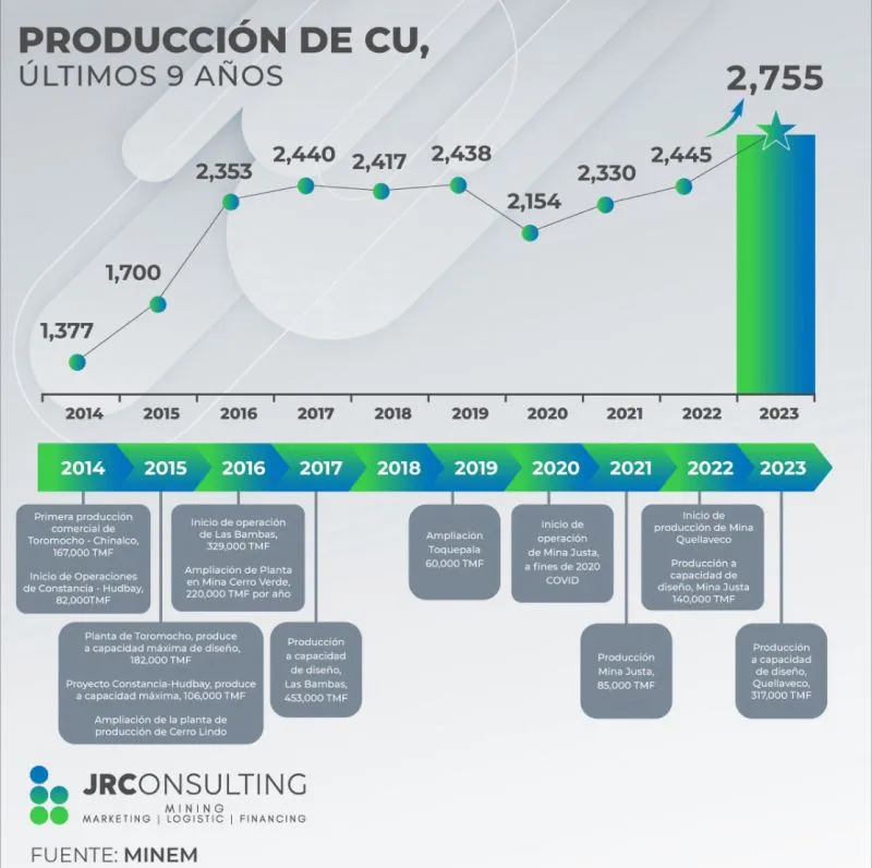 Con puesta en producción en el 2021 y una producción estimada de 340.000 toneldas y aprox. 280.000 toneladas, respectivamente. Perú por su parte puso en operación varios proyectos que le permitió duplicar su producción en este periodo, detalles a continuación (de 2014 a 2023): Toromocho - Minera Chinalco Perú S.A. Constancia - Hudbay Peru S.A.C. Ampliación de la planta de producción de CerroLindo - Nexa Resources - Minera Las Bambas. Ampliación de Planta en Mina CerroVerde - Sociedad Minera- Cerro Verde. Ampliación Toquepala - SOUTHERN PERU COPPER CORPORATION. Inicio de operación de MinaJusta - Marcobre. Inicio de producción de Mina Quellaveco - Anglo American Quellaveco S.A.