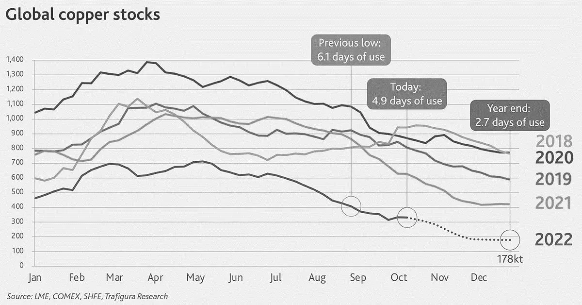 Se espera que la producción de la mina de cobre en 2022 sea de 21,90 millones de toneladas. El inventario en LME y Shanghái se está agotando a corto plazo con los mercados funcionando con una cobertura de inventarios de 4,9 días de consumo global (la previsión para fin de año es de 2,7 días).