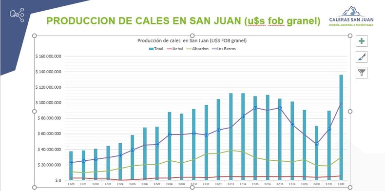 Las empresas que producen el “oro blanco” sanjuanino están asentadas a lo largo de la franja geográfica donde se extiende el recurso -en Jáchal, Albardón y Los Berros-; y en el 2022 produjeron 1.300.000 toneladas de cal, de las cuales 430.000 toneladas fueron exportadas principalmente a Chile. Los ingresos por la venta a granel en el mercado interno y externo superaron los 130 millones de dólares.