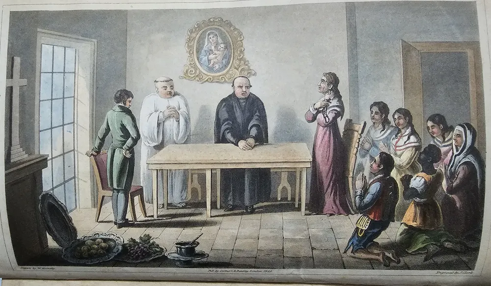 Llama la atención que el obispo y el fraile están de pie en una banqueta, doña Juliana en una gran silla y Temple en la silla con terciopelo. Probablemente ese orden haya cambiado durante el almuerzo ya que el obispo tenía siempre reservada la mejor silla. Varias cosas le llaman la atención a Temple, entre ellas las rollizas anatomías de los sacerdotes acostumbrados a los generosos almuerzos y cenas. Especialmente se refiere al dominico comentando que su “corpulencia me hizo sospechar maliciosamente que estaba acostumbrado más a festejar que a ayunar”.