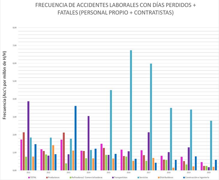 El Instituto Argentino del Petróleo y el Gas (IAPG), en 2021, publicó un reporte de los accidentes en yacimientos a nivel nacional entre 2011 y 2020, que mostraba "una marcada disminución, siendo los dos principales sectores a atender el de servicios y el de construcción e ingeniería". Con este gráfico elocuente