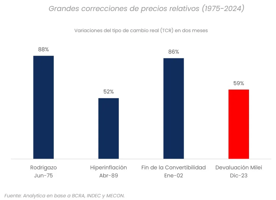 Según el documento de los especialistas, una devaluación de la magnitud de la que realizó al asumir el presidente Milei tiene sólo tres precedentes: junio de 1975 (el “Rodrigazo”), febrero de 1989 (momento en el que el BCRA suspendió las intervenciones en el mercado de cambios, iniciándose una aceleración de los precios cercana a la hiperinflación) y enero de 2002 (el final de la convertibilidad).